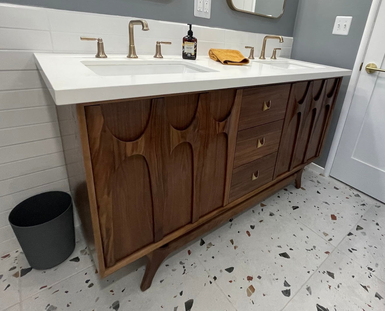 A Mid-Century Brasilia style double sink bathroom vanity, handcrafted in California. Made from American walnut solid and veneer, featuring hand-carved Brasilia doors, soft-close drawers, and brass-colored pulls. Ships fully assembled and ready for your countertop.